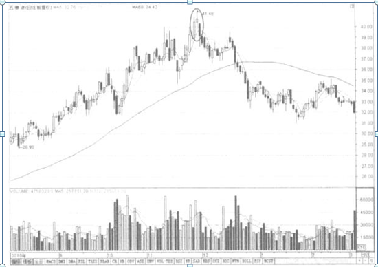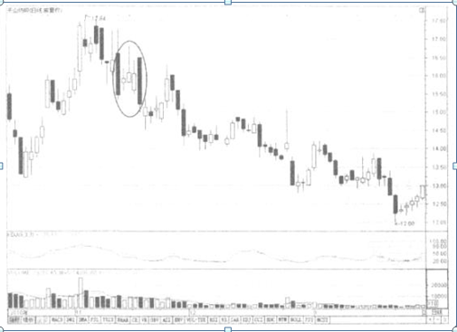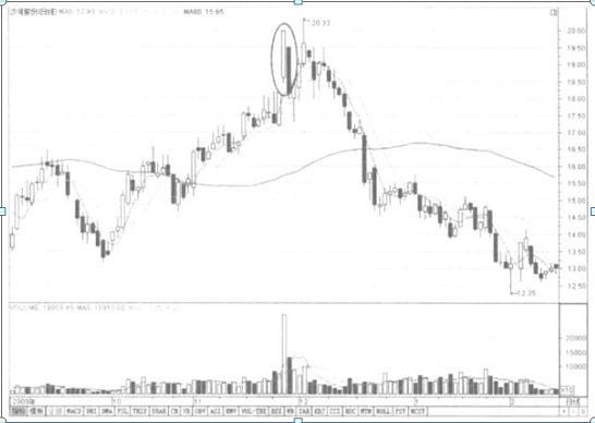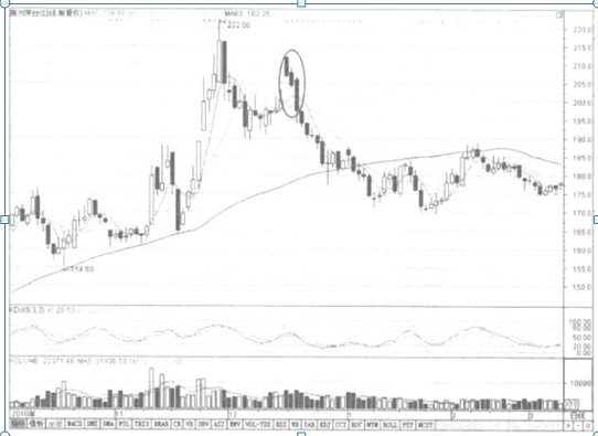 如图2-45所示的五粮液,便是在股价高涨的末期出现了薄暮之星的组合。股价随后启动转为着落行情。