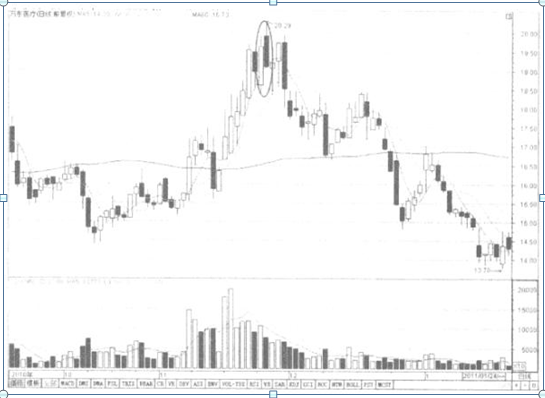 如图2-47所示的万东医疗股价在快速拉升并贯穿创下历史新高后,在顶部造成了彤云密布的组合,讲明多方和空方力量启动逆转,空方力量增强,随后进入了回调下降通说念。