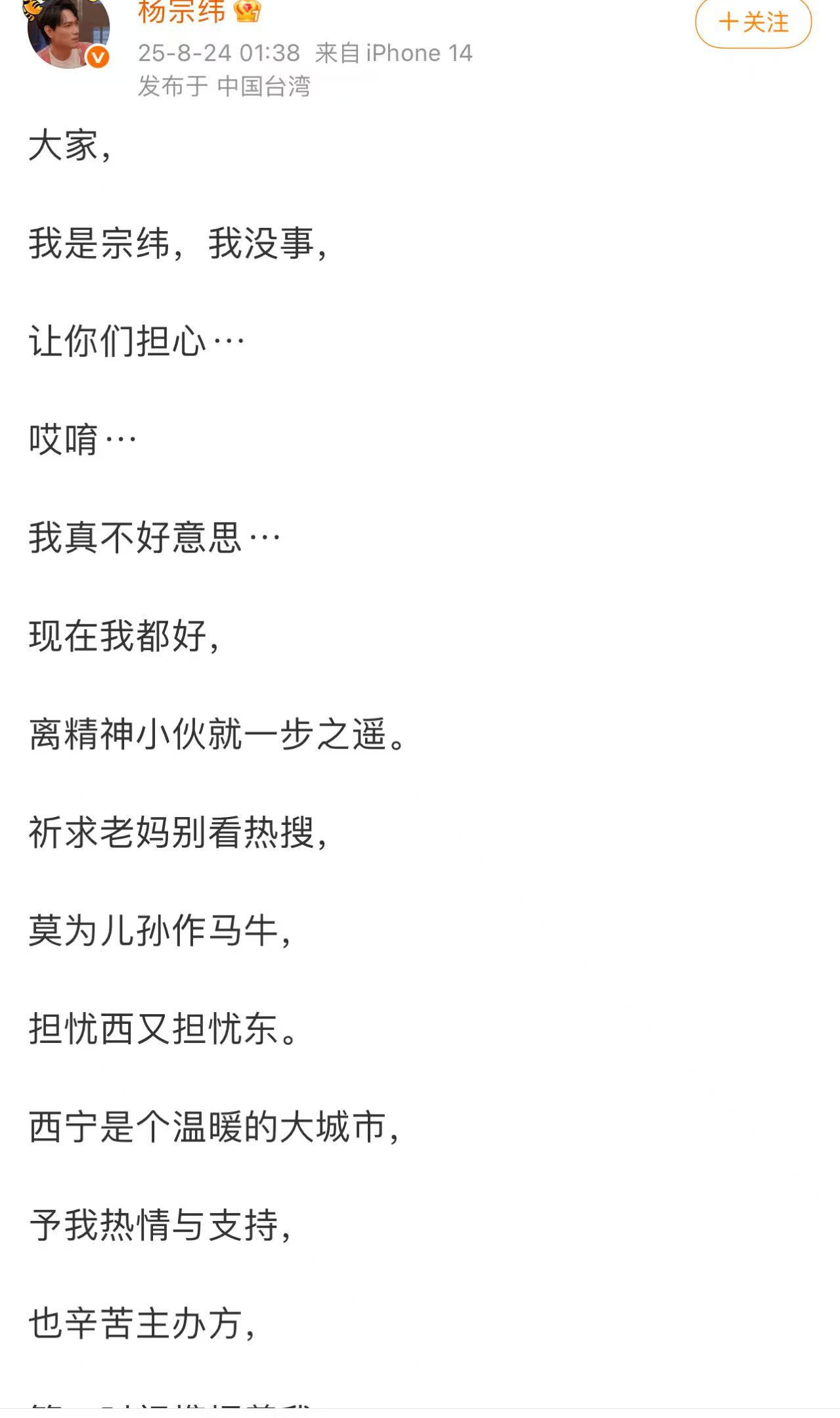 8月24日凌晨,杨宗纬在酬酢平台报祯祥。称“当今我齐好,离精神小伙就一步之遥,祈求老妈别看热搜。”